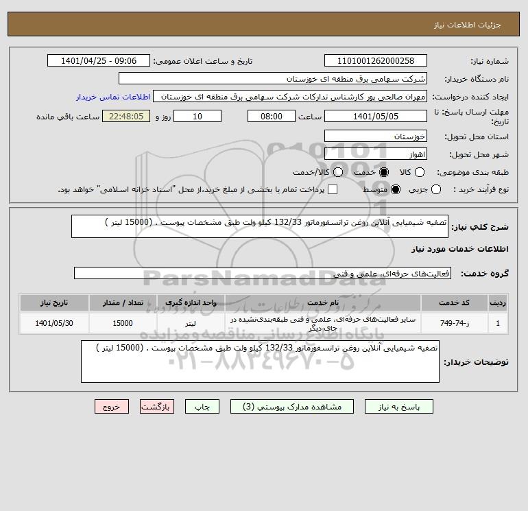 توضیحات خریدار:تصفیه شیمیایی آنلاین روغن ترانسفورماتور 132/33 کیلو ولت طبق مشخصات پیوست . (15000 لیتر )