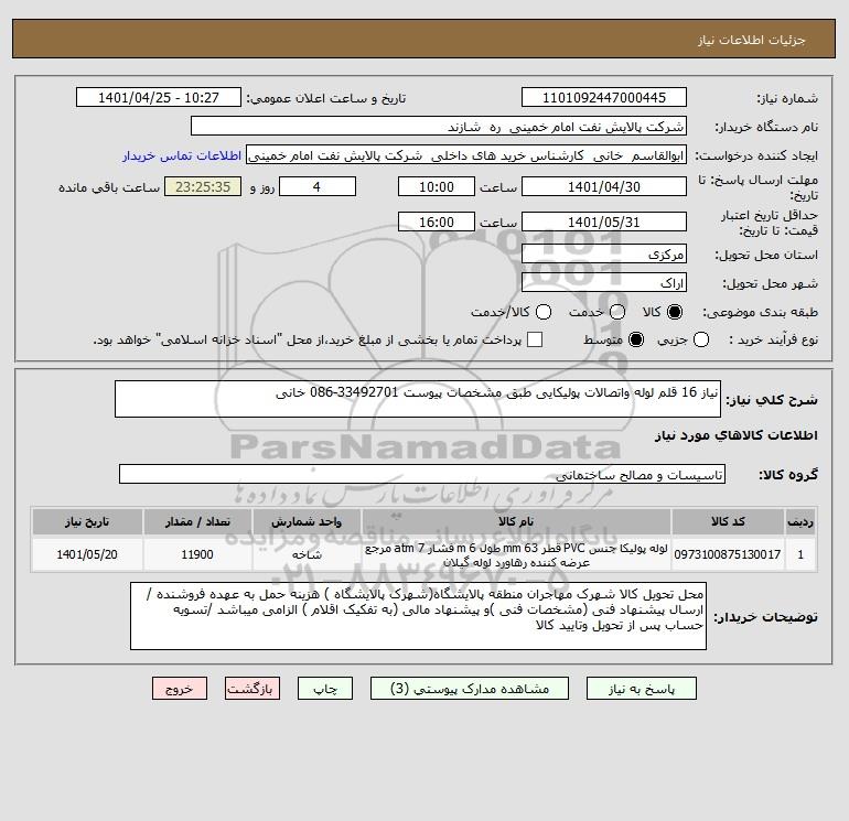 شرح کلی نیاز: نیاز 16 قلم لوله واتصالات پولیکایی طبق مشخصات پیوست 33492701-086 خانی