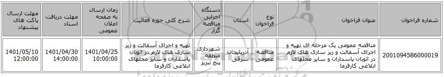 | 2001094586000019 | مناقصه عمومی یک مرحله ای تهیه و اجرای آسفالت و زیر سازی های لازم در اتوبان پاسداران و سایر محلهای ابلاغی کارفرما | مناقصه عمومی | آذربایجان شرقی | شهرداری منطقه پنج تبریز | تهیه و اجرای آسفالت و زیر سازی های لازم در اتوبان پاسداران و سایر محلهای ابلاغی کارفرما | 1401/04/25 10:00:00 | 1401/04/30 14:00:00 | 1401/05/10 12:00:00 |