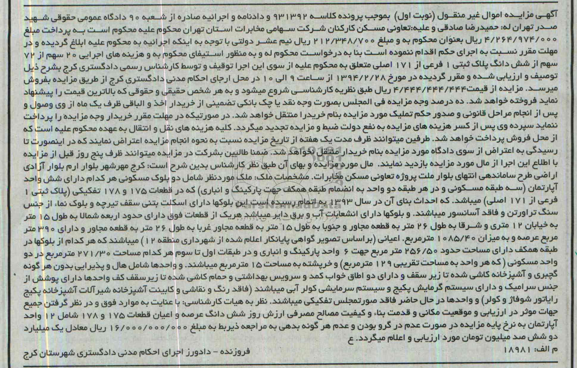 - مزایده ششدانگ یک دستگاه آپارتمان مسکونی واقع در سمت غربی طبقه ششم به مساحت 94.92 متر مربع