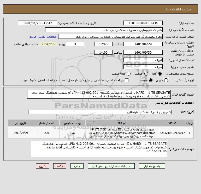استعلام HARD – 1 TB SEAGATE با گارانتی و ضمانت یکساله PN: 412-002-001با کارشناس هماهنگ شود ایران کد جهت تشابه است - نحوه پرداخت پنج ماهه کاری است -, استعلام HARD – 1 TB SEAGATE با گارانتی و ضمانت یکساله PN: 412-002-001با کارشناس هماهنگ شود ایران کد جهت تشابه است - نحوه پرداخت پنج ماهه کاری است -
