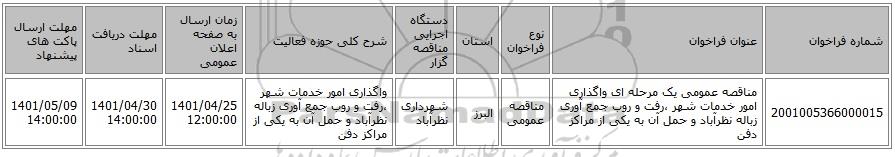 | 2001005366000015 | مناقصه عمومی یک مرحله ای واگذاری امور خدمات شهر ،رفت و روب جمع آوری زباله نظرآباد و حمل آن به یکی از مراکز دفن | مناقصه عمومی | البرز | شهرداری نظرآباد | واگذاری امور خدمات شهر ،رفت و روب جمع آوری زباله نظرآباد و حمل آن به یکی از مراکز دفن | 1401/04/25 12:00:00 | 1401/04/30 14:00:00 | 1401/05/09 14:00:00 |