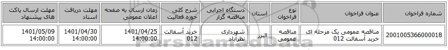 | 2001005366000018 | مناقصه عمومی یک مرحله ای خرید آسفالت 012 | مناقصه عمومی | البرز | شهرداری نظرآباد | خرید آسفالت 012 | 1401/04/25 14:00:00 | 1401/04/30 14:00:00 | 1401/05/09 14:00:00 |