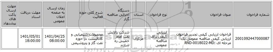 | 2001092447000087 | فراخوان ارزیابی کیفی تجدید فراخوان ارزیابی کیفی مناقصه عمومی یک مرحله ای :RND-0018022-MD | ارزیابی کیفی برای مناقصه عمومی | مرکزی | شرکت پالایش نفت امام خمینی ره شازند | محصولات شیمیایی و کاتالیست در حوزه نفت گاز و پتروشیمی | 1401/04/25 08:00:00 | 1401/05/01 18:00:00 |