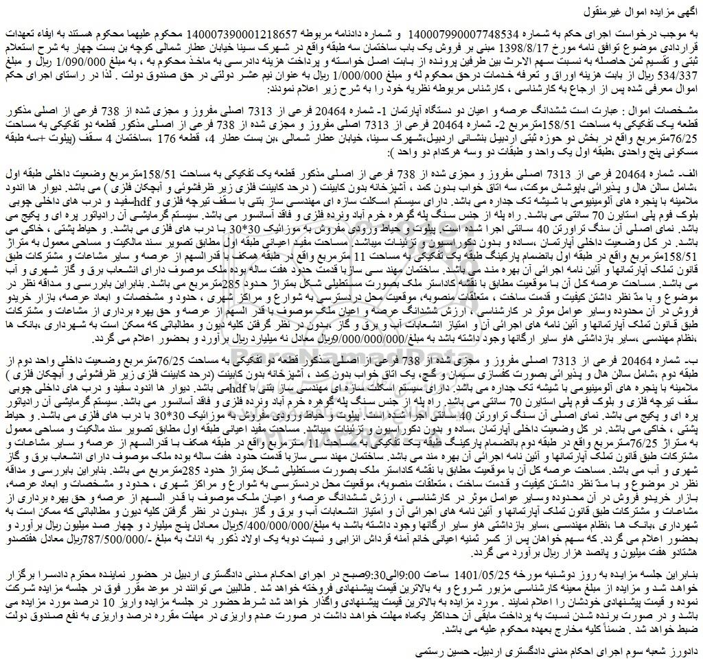 مشخصات اموال : عبارت است ششدانگ عرصه و اعیان دو دستگاه آپارتمان 1- شماره 20464 فرعی از 7313 اصلی مفروز و مجزی شده از 738 فرعی از اصلی مذکور قطعه یک تفکیکی به مساحت 158/51مترمربع 2- شماره 20464 فرعی از 7313 اصلی مفروز و مجزی شده از 738 فرعی از اصلی مذکور قطعه دو تفکیکی به مساحت 76/25مترمربع واقع در بخش دو حوزه ثبتی اردبیل بنشانی اردبیل،شهرک سینا، خیابان عطار شمالی ،بن بست عطار 4، قطعه 176 ،ساختمان 4 سقف (پیلوت +سه طبقه مسکونی پنج واحدی ،طبقه اول یک واحد و طبقات دو وسه هرکدام دو واحد ):