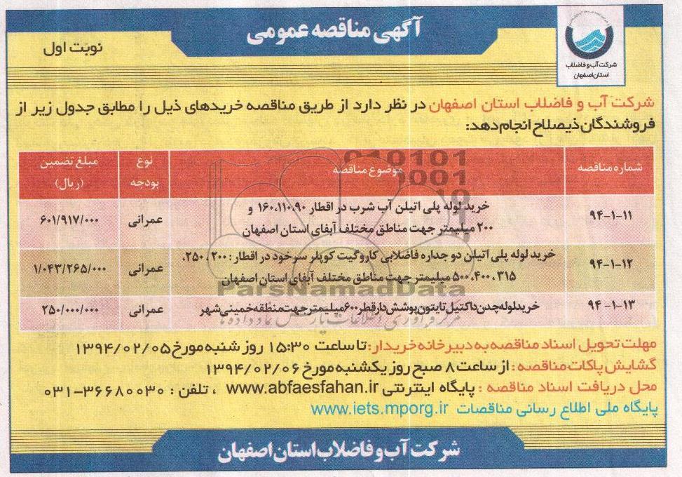 | 11-1-94 | خرید لوله پلی اتیلن آب شرب در اقطار 160،110،90 و 200 میلیمتر جهت مناطق مختلف آبفای استان اصفهان | عمرانی | 601.917.000 |