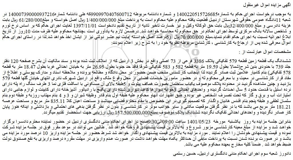 به موجب درخواست اجرای حکم به شماره1400220515726685 و شماره دادنامه مربوطه 9909970407600712که طی دادنامه شماره140007390000937216 در شعبه 11دادگاه عمومی حقوقی شهرستان اردبیل قطعیت یافته محکوم علیه محکوم است به پرداخت مبلغ 1/400/000/000 ریال اصل خواسته و مبلغ61/280/000 ریال بابت هزینه دادرسی و مبلغ 32/400/000ریال بابت حق الوکاله وکیل و نیز خسارت تاخیر تادیه از تاریخ تقدیم دادخواست 1397/11/01 لغایت اجرای حکم که بر اساس نرخ تورم و شاخص سالانه بانک مرکزی توسط اجرای احکام در حق محکوم له محاسبه خواهد شد. درضمن لازم به یادآوری است ،چنانچه محکوم علیه ظرف مدت 10روز از تاریخ ابلاغ اجرائیه نسبت به اجرای حکم اقدام ننماید،مبلغ 70/000/000ریال (5درصد اصل خواسته )بابت نیم عشر دولتی نیز از ایشان اخذ خواهد شد.لذا در راستای اجرای حکم اموال معرفی شده پس از ارجاع به کارشناسی ، کارشناس مربوطه نظریه خود را به شرح زیر اعلام نمودند: