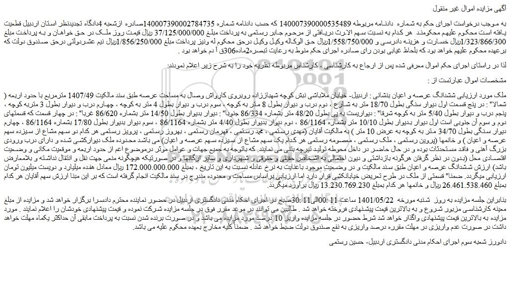 به موجب درخواست اجرای حکم به شماره  دادنامه مربوطه 140007390000535489 که حسب دادنامه شماره 140007390002784735صادره ازشعبه 4دادگاه تجدیدنظر استان اردبیل قطعیت یافته است محکوم علیهم محکومند  هر کدام به نسبت سهم الارث دریافتی از مرحوم جابر رستمی به پرداخت مبلغ 37/125/000/000 ریال قیمت روز ملک در حق خواهان و به پرداخت مبلغ 1/323/866/300ریال خسارت و هزینه دادرسی و 1/558/750/000ریال حق الوکاله وکیل وکیل درحق محکوم له ونیز پرداخت مبلغ 1/856/250/000ریال نیم عشردولتی درحق صندوق دولت که برعهده محکوم علیهم خواهد بود که بلحاظ غیابی بودن رای صادره اجرای حکم منوط به رعایت تبصره2ماده306ق آ دم خواهد بود .