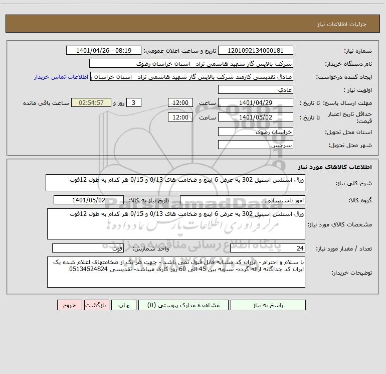 شرح کلی نیاز: ورق استلس استیل 302 به عرض 6 اینچ و ضخامت های 0/13 و 0/15 هر کدام به طول 12فوت