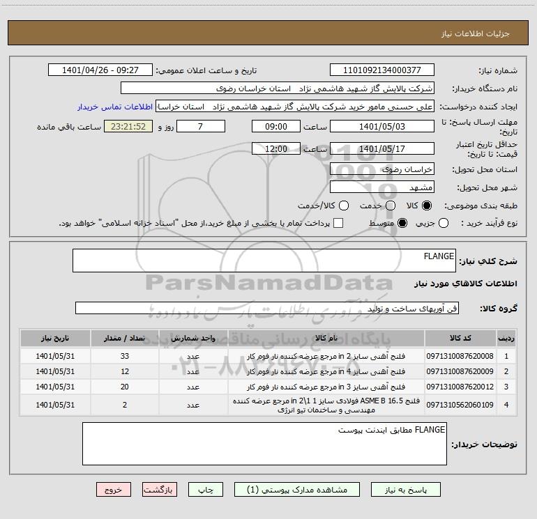 نام دستگاه خریدار:شرکت پالایش گاز شهید هاشمی نژاد استان خراسان رضوی