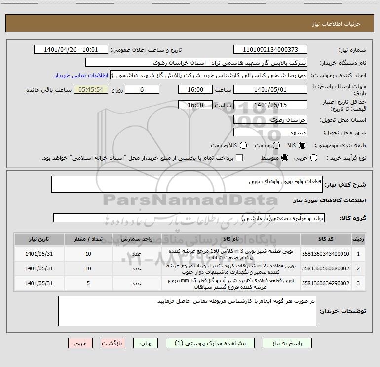 نام دستگاه خریدار:شرکت پالایش گاز شهید هاشمی نژاد استان خراسان رضوی
