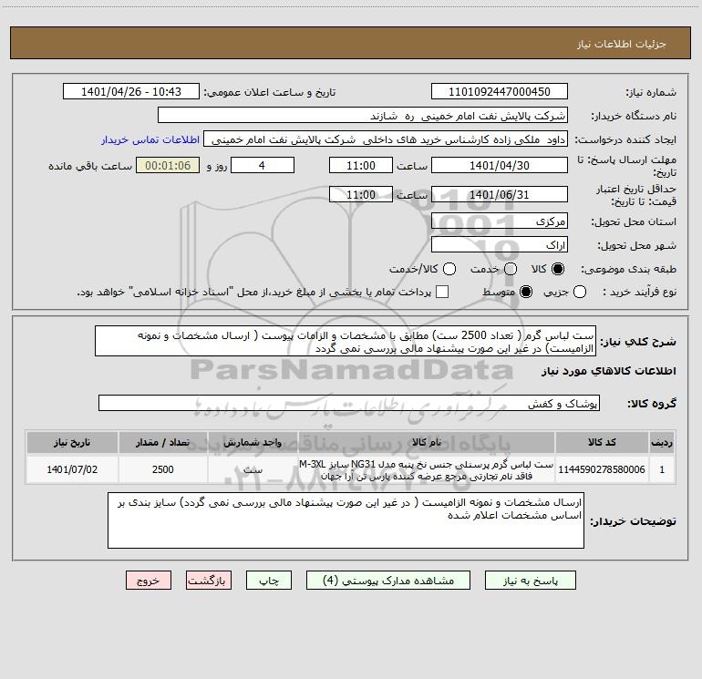 شرح کلی نیاز: ست لباس گرم ( تعداد 2500 ست) مطابق با مشخصات و الزامات پیوست ( ارسال مشخصات و نمونه الزامیست) در غیر این صورت پیشنهاد مالی بررسی نمی گردد