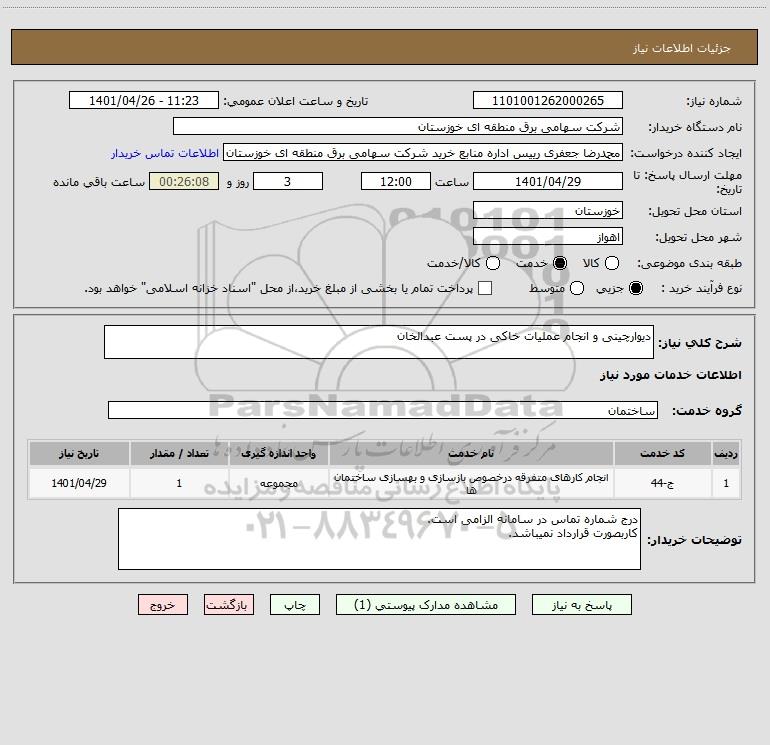 شرح کلی نیاز: دیوارچینی و انجام عملیات خاکی در پست عبدالخان