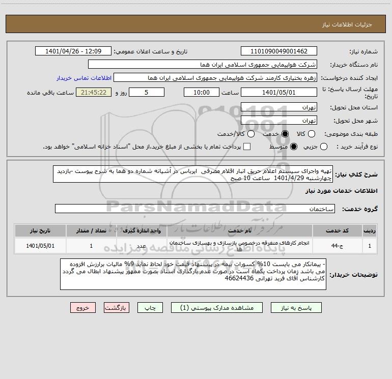شرح کلی نیاز: تهیه واجرای سیستم اعلام حریق انبار اقلام مصرفی ایرباس در آشیانه شماره دو هما به شرح پیوست -بازدید چهارشنبه 1401/4/29 ساعت 10 صبح