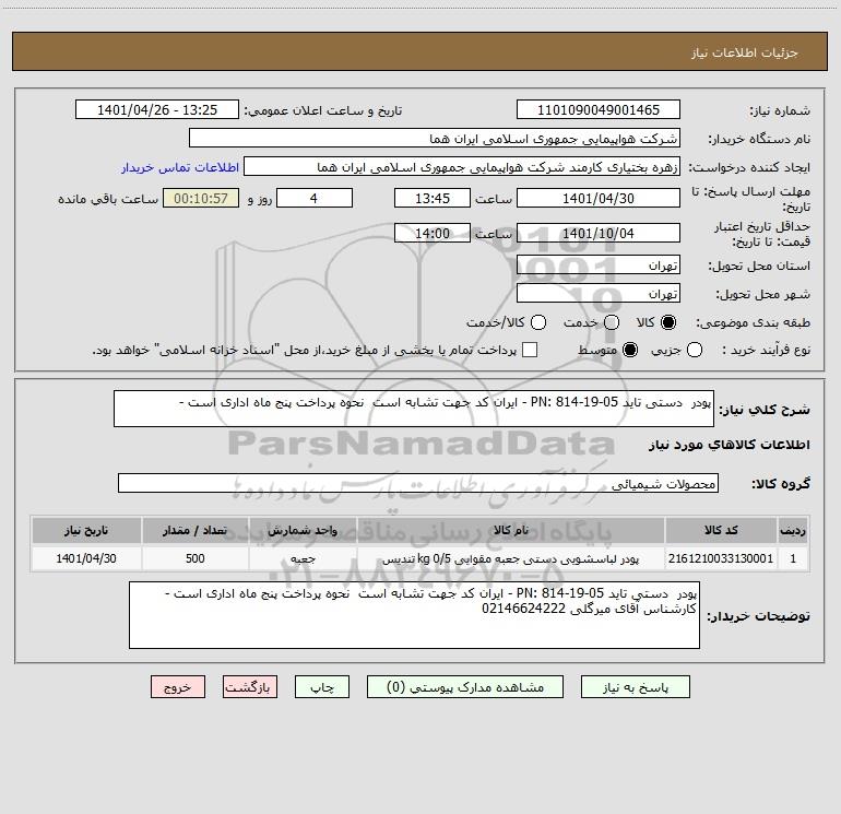 استعلام پودر دستی تاید PN: 814-19-05 - ایران کد جهت تشابه است نحوه پرداخت پنج ماه اداری است -, استعلام پودر دستی تاید PN: 814-19-05 - ایران کد جهت تشابه است نحوه پرداخت پنج ماه اداری است -