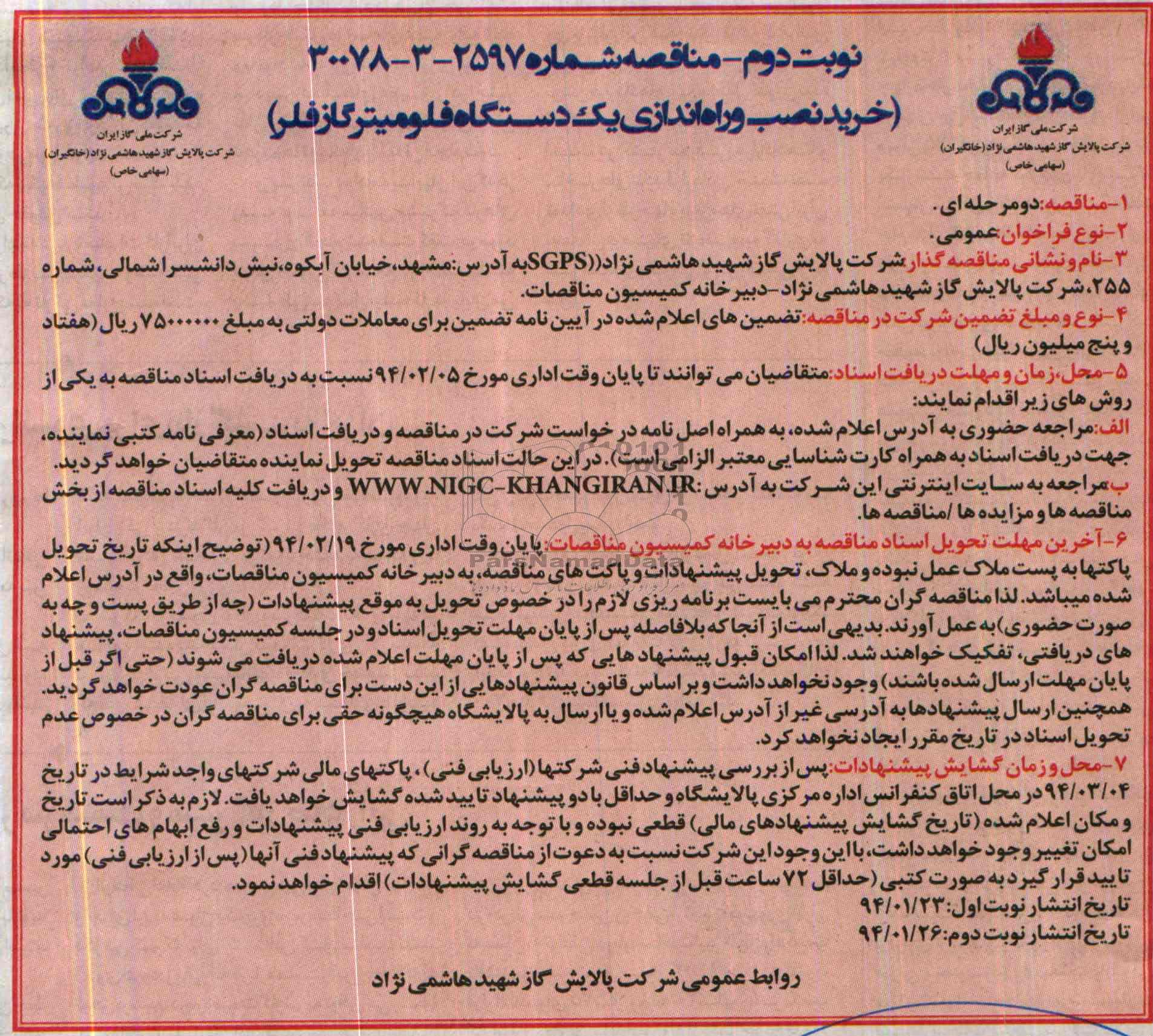 نام ونشانی مناقصه گذار: شرکت پالایش گاز شهید هاشمی نژاد (SGPC) به آدرس: مشهد، خیابان آبکوه، نبش دانشسرای شمالی، شماره 255، شرکت پالایش گاز شهید هاشمی نژاد، دبیرخانه کمیسیون مناقصات