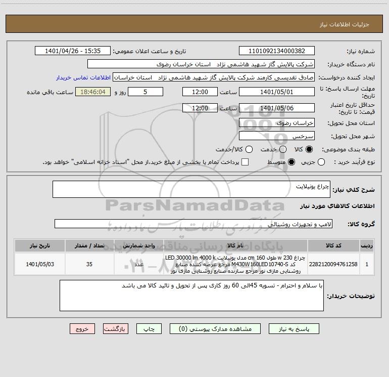 نام دستگاه خریدار:شرکت پالایش گاز شهید هاشمی نژاد استان خراسان رضوی