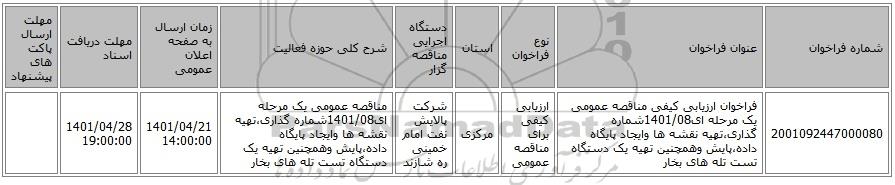 | 2001092447000080 | فراخوان ارزیابی کیفی مناقصه عمومی یک مرحله ای1401/08شماره گذاری،تهیه نقشه ها وایجاد پایگاه داده،پایش وهمچنین تهیه یک دستگاه تست تله های بخار | ارزیابی کیفی برای مناقصه عمومی | مرکزی | شرکت پالایش نفت امام خمینی ره شازند | مناقصه عمومی یک مرحله ای1401/08شماره گذاری،تهیه نقشه ها وایجاد پایگاه داده،پایش وهمچنین تهیه یک دستگاه تست تله های بخار | 1401/04/21 14:00:00 | 1401/04/28 19:00:00 |