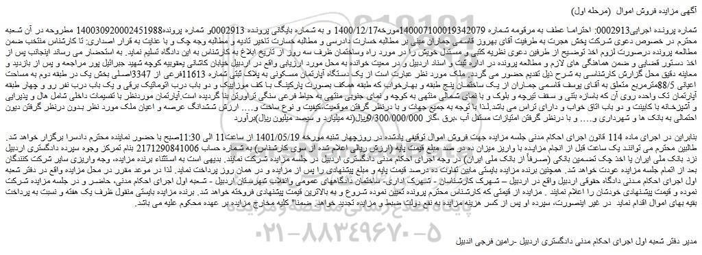 شعبه صادر کننده:شعبه اول اجرای احکام مدنی دادگستری شهرستان اردبیل/قدیم