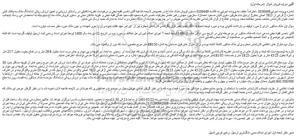 شماره پرونده اجرایی0100449 -احتراماً عطف به پرونده اجرایی به کلاسه 0100449 دستور فروش ملک مشاع در خصوص لایحه دفاعیه آقای ناصر فقیه نجفی و درخواست نظریه تکمیلی در راستای ارزیابی و تعیین ارزش ریالی ششدانگ ملک به پلاک ثبتی شماره 2 فرعی از 7613 اصلی بخش2 اردبیل بنام طرفین دعوی قایان مسعود احمدنژاد سقزچی- مهدی رهبر مقدس بطرفیت ناصر-اشرف-مجید-محمد-سعید همگی فقیه نجفی و علویه عاشقان مبنی بر دستور فروش ملک مشاع بدینوسیله به استحضار می رساند اینجانب تحت عنوان کارشناس منتخب ضمن مطالعه مجدد پرونده و اطلاع از قرار کارشناسی نظریه کارشناسی خویش را در چارچوب خواسته آن دادگاه محترم و با اسناد به مدارک جدید ارسال می نمایم.