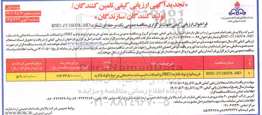 فراخوان ارزیابی کیفی جهت برگزاری مناقصه عمومی یک مرحله ای شماره RND - 0118004 - MD