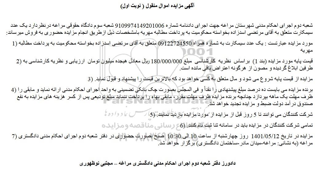 شعبه دوم اجرای احکام مدنی شهرستان مراغه جهت اجرای دادنامه شماره 9109974149201006 شعبه سوم دادگاه حقوقی مراغه درنظردارد یک عدد سیمکارت متعلق به آقای مرتضی اسدزاده بخواسته محکومیت به پرداخت مطالبه مهریه بامشخصات ذیل ازطریق انجام مزایده حضوری به فروش میرساند: