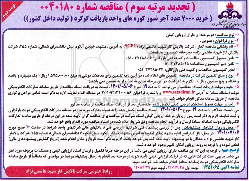علاقهمندان میتوانند جهت دریافت اسناد و اطلاعات تکمیلی، خرید 7000 عدد آجر نسوز کوره های واحد بازیافت گوگرد (تولید داخل کشور) تجدید مرتبه سوم نوبت دوم با سامانه مناقصات و مزایدات ایران پارسنماد داده ها 88349670 تماس حاصل نمایند.