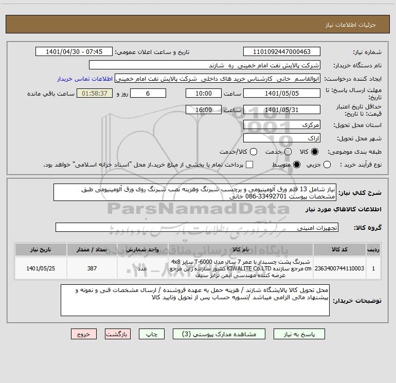 شرح کلی نیاز: نیاز شامل 13 قلم ورق آلومینیومی و برچسب شبرنگ وهزینه نصب شبرنگ روی ورق آلومینیومی طبق مشخصات پیوست 33492701-086 خانی