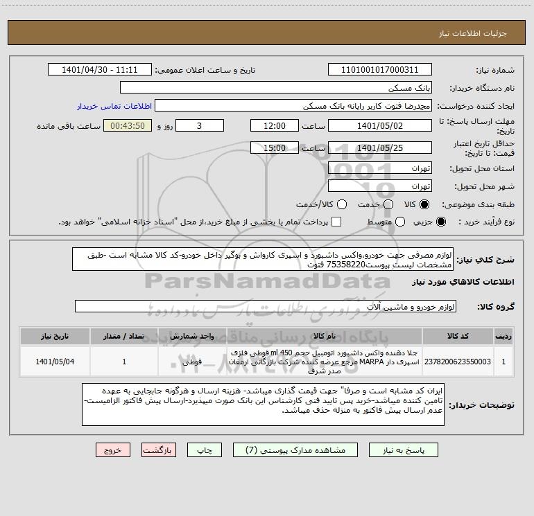 شرح کلی نیاز: لوازم مصرفی جهت خودرو،واکس داشبورد و اسپری کارواش و بوگیر داخل خودرو-کد کالا مشابه است -طبق مشخصات لیست پیوست75358220 فتوت