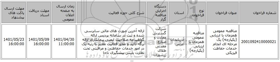 مناقصه، مناقصه عمومی همزمان با ارزیابی (یکپارچه) یک مرحله ای انجام خدمات حفاظت فیزیکی, مناقصه، مناقصه عمومی همزمان با ارزیابی (یکپارچه) یک مرحله ای انجام خدمات حفاظت فیزیکی