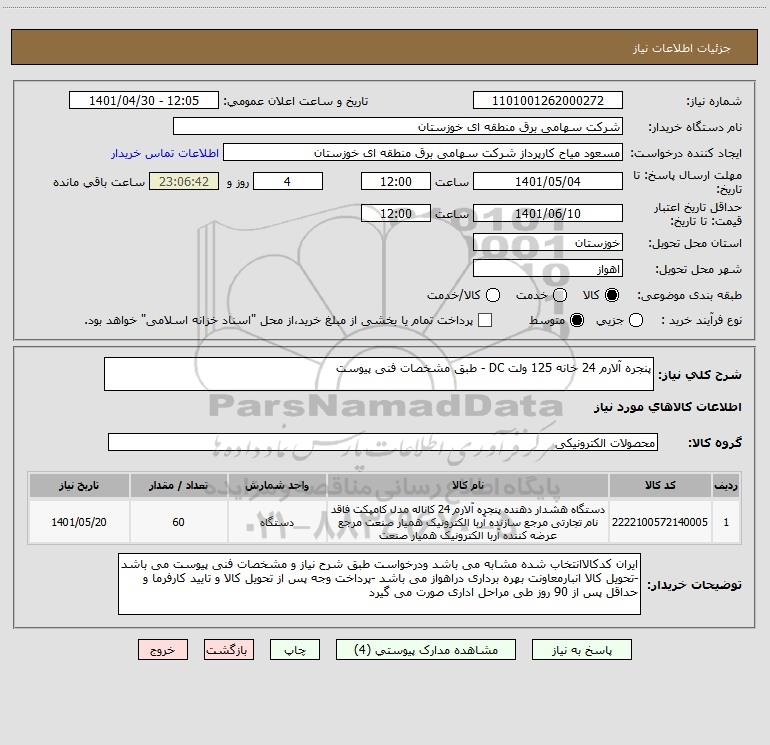 شرح کلی نیاز: پنجره آلارم 24 خانه 125 ولت DC - طبق مشخصات فنی پیوست