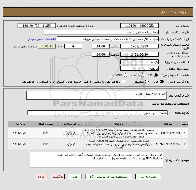 | 1 | 2134500241740001 | کیسه زباله زرد عفونی بیمارستانی سایز 70x90 cm فاقد مدل فاقد بسته بندی مقدار کیلوگرمی نام تجارتی برتر پلاستیک مرجع عرضه کننده دانش تجهیز گستران آراد | کیلوگرم | 1000 | 1401/05/03 |