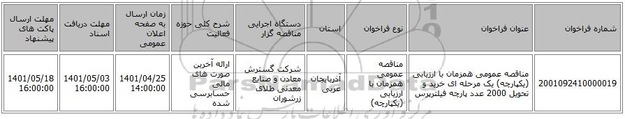 2001092410000019مناقصه عمومی همزمان با ارزیابی (یکپارچه) یک مرحله ای خرید و تحویل 2000 عدد پارچه فیلترپرسمناقصه عمومی همزمان با ارزیابی (یکپارچه)آذربایجان غربیشرکت گسترش معادن و صنایع معدنی طلای زرشورانارائه آخرین صورت های مالی حسابرسی شده1401/04/25 14:00:001401/05/03 16:00:001401/05/18 16:00:00
