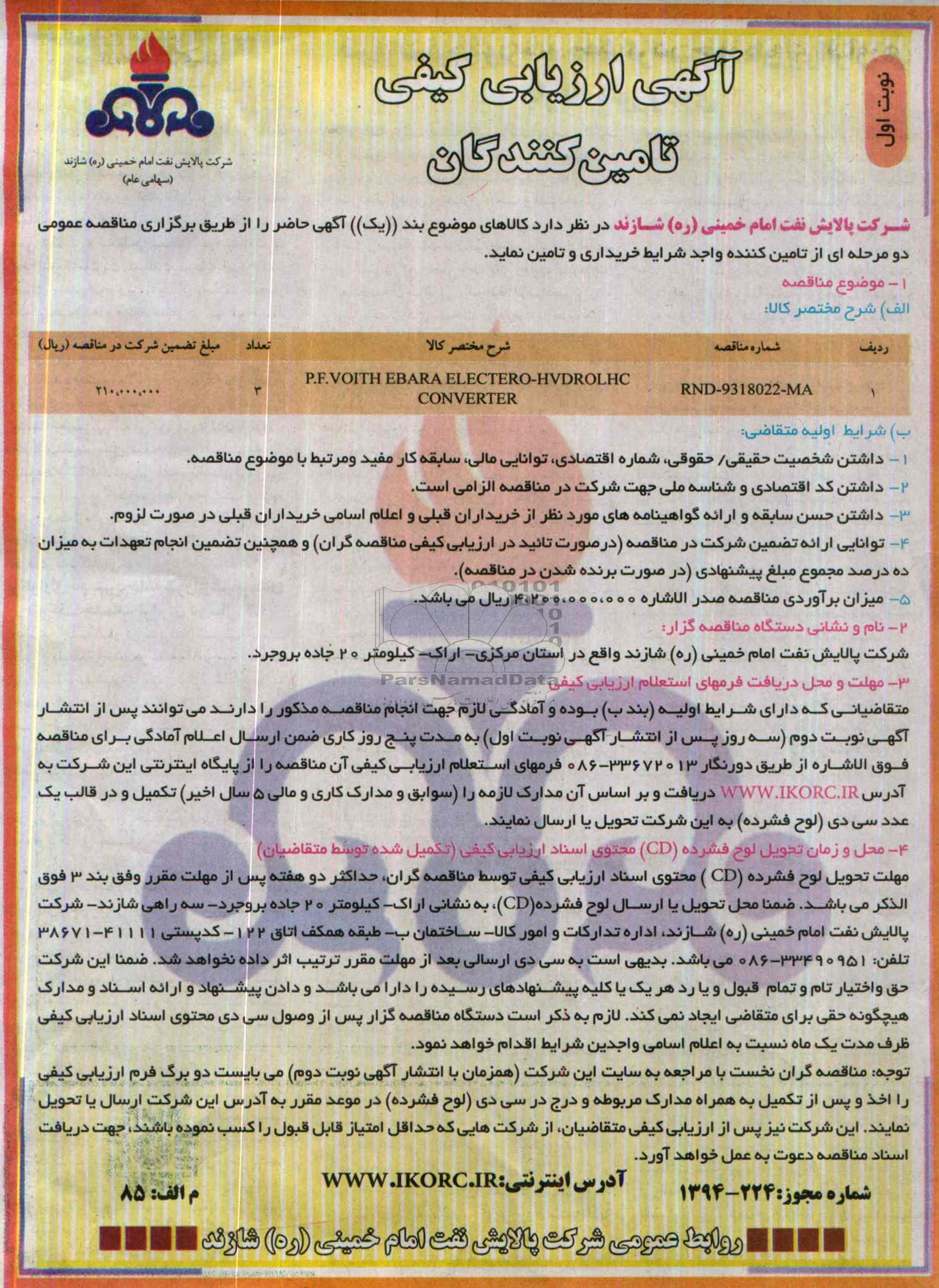 متقاضیانی که دارای شرایط اولیه بند ب بوده و آمادگی لازم جهت انجام هر یک از مناقصات مذکور را دارند می توانند پس از انتشار آگهی نوبت دوم سه روز پس از انتشار آگهی نوبت اول به مدت پنج روز کاری ضمن ارسال اعلام آمادگی برای مناقصه فوق الاشاره از طریق دورنگار 33672013-086 فرمهای استعلام ارزیابی کیفی را از پایگاه اینترنتی این شرکت به آدرس WWW.IKORC.IR دریافت و بر اساس آن مدارک لازمه را تکمیل و به این شرکت تحویل یا ارسال نمایند