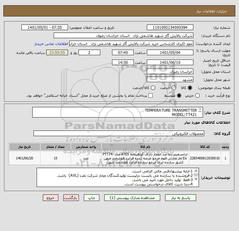 شرح کلی نیاز: TEMPERATURE TRANSMITTER MODEL:TT421 P/N: L3/T4/E1/BU/MO/SO