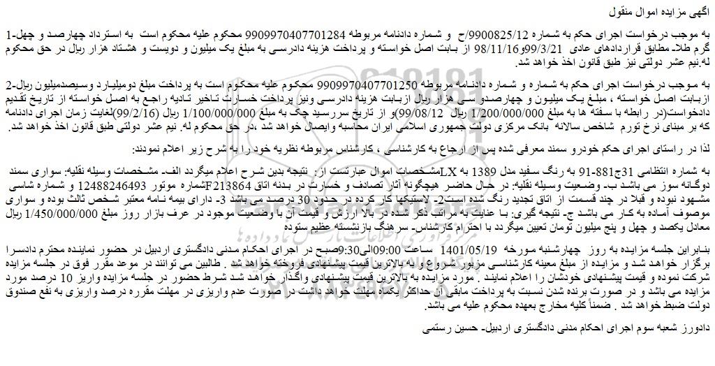 بنابراین جلسه مزایده به روز  چهارشنبه مورخه  1401/05/19  ساعت 09:00الی9:30صبح در اجرای احکام مدنی دادگستری اردبیل در حضور نماینده محترم دادسرا برگزار خواهد شد و مزایده از مبلغ معینه کارشناسی مزبور شروع و به بالاترین قیمت پیشنهادی فروخته خواهد شد . طالبین می توانند در موعد مقرر فوق در جلسه مزایده شرکت نموده و قیمت پیشنهادی خودشان را اعلام نمایند . مورد مزایده به بالاترین قیمت پیشنهادی واگذار خواهد شد شرط حضور در جلسه مزایده واریز 10 درصد مورد مزایده می باشد و در صورت برنده شدن نسبت به پرداخت مابقی آن حداکثر یکماه مهلت خواهد داشت در صورت عدم واریزی در مهلت مقرره درصد واریزی به نفع صندوق دولت ضبط خواهد شد . ضمناً کلیه مخارج بعهده محکوم علیه می باشد.