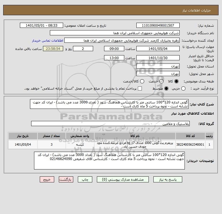 شرح کلی نیاز: گونی اندازه 120*100 سانتی متر با کارشناس هماهنگ شود ( تعداد 3000 عدد می باشد) - ایران کد جهت تشابه است - نحوه پرداخت 5 ماه کاری است -