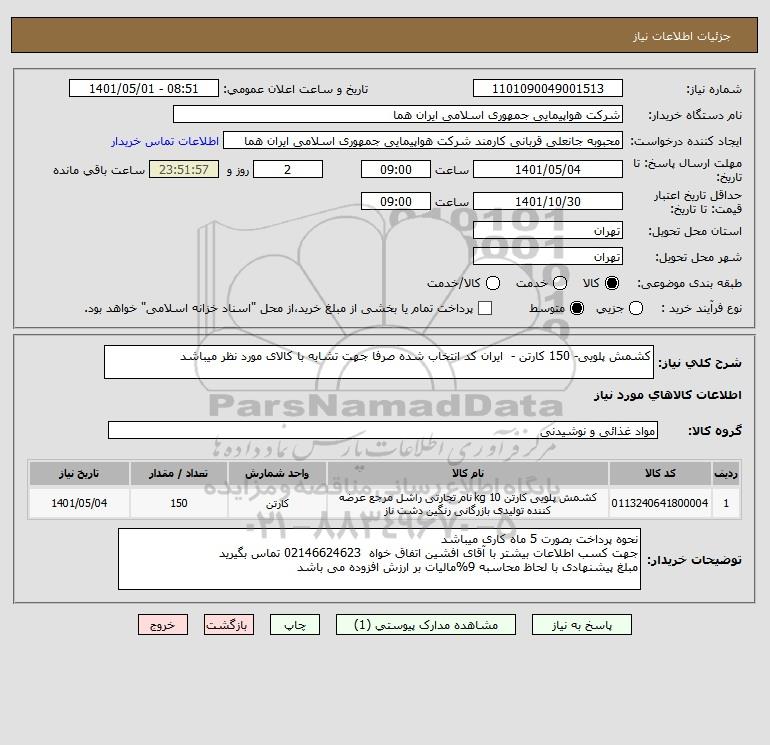 شرح کلی نیاز: کشمش پلویی- 150 کارتن - ایران کد انتخاب شده صرفا جهت تشابه با کالای مورد نظر میباشد