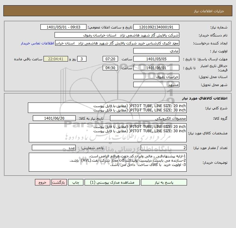 مشخصات کالای مورد نیاز: PITOT TUBE, LINE SIZE: 20 inch( (مطابق با فایل پیوست