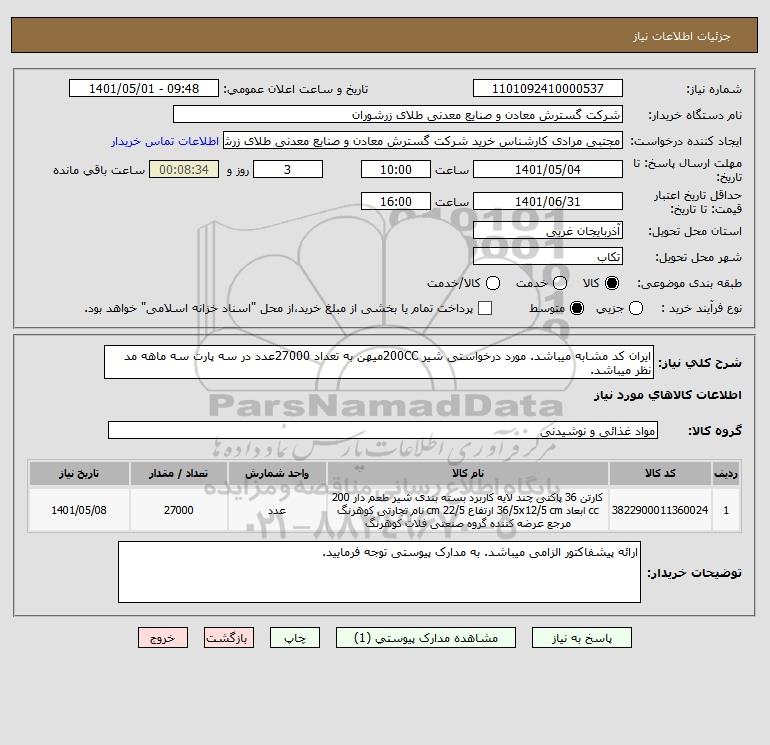 نام دستگاه خریدار:شرکت گسترش معادن و صنایع معدنی طلای زرشوران