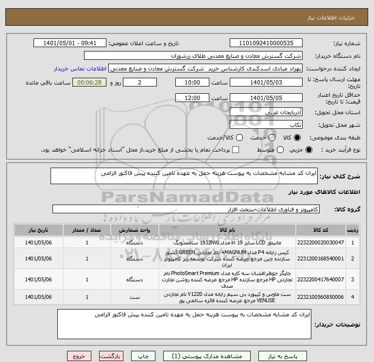شرح کلی نیاز: ایران کد مشابه مشخصات به پیوست هزینه حمل به عهده تامین کننده پیش فاکتور الزامی