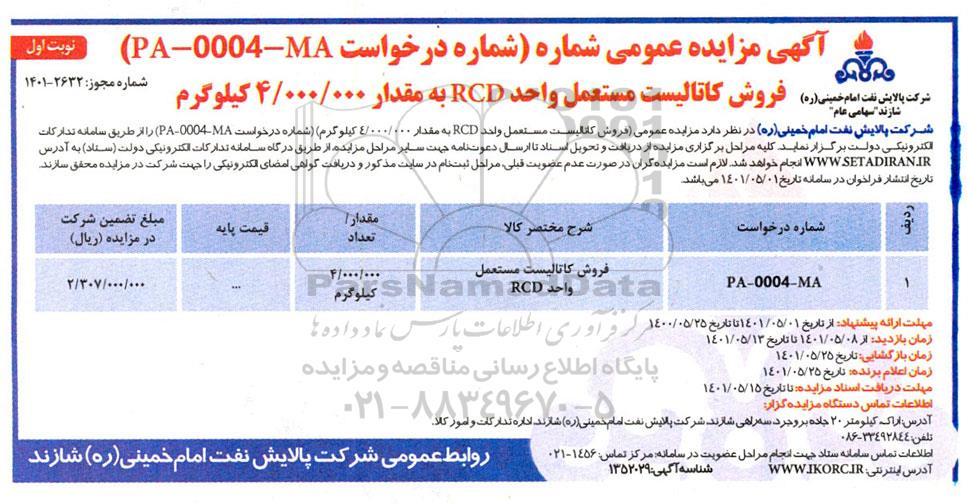 | PA-0004-MA | فروش کاتالیست مستعمل واحد RCD | 4.000.000 کیلوگرم | - | 2.307.000.000 |