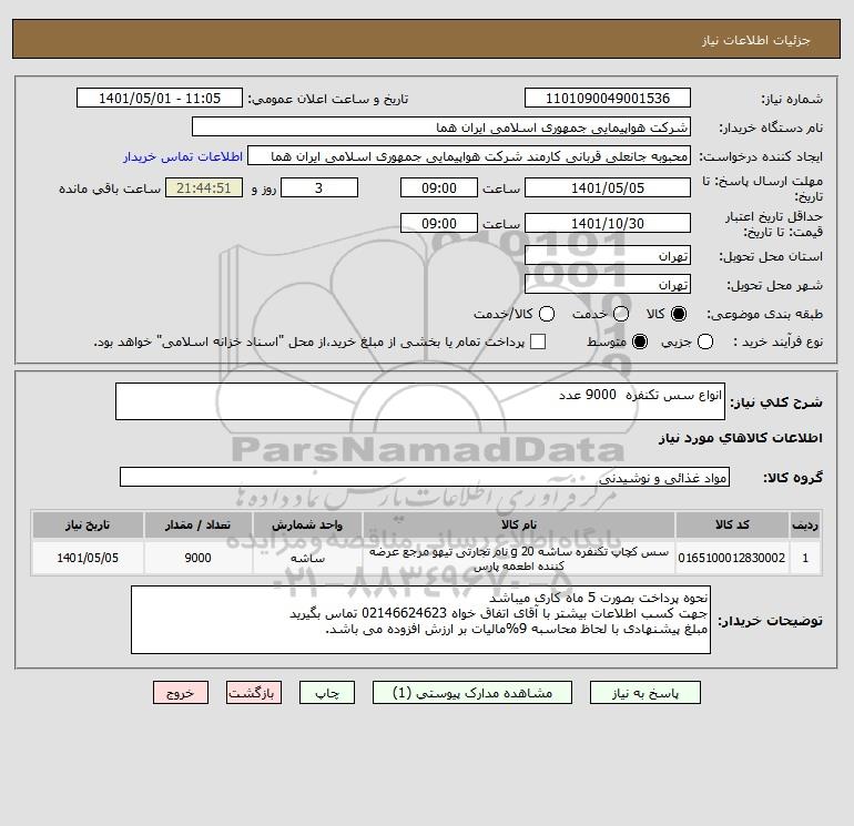 شرح کلی نیاز: انواع سس تکنفره 9000 عدد