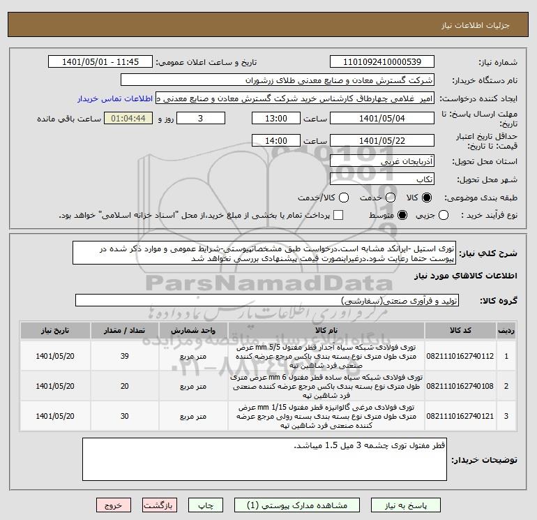 شرح کلی نیاز: توری استیل -ایرانکد مشابه است.درخواست طبق مشخصاتپیوستی-شرایط عمومی و موارد ذکر شده در پیوست حتما رعایت شود.درغیراینصورت قیمت پیشنهادی بررسی نخواهد شد