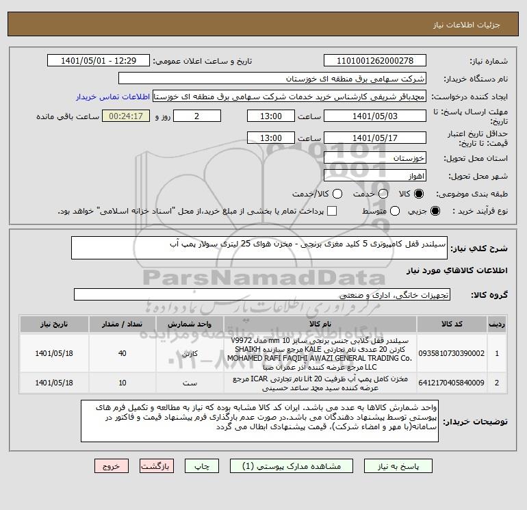 شرح کلی نیاز: سیلندر قفل کامپیوتری 5 کلید مغزی برنجی - مخزن هوای 25 لیتری سولار پمپ آب