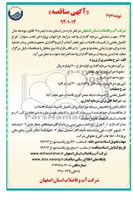 شرکت آب و فاضلاب استان اصفهان در نظر دارد در راستای بنده تبصره 19 قانون بودجه سال 1394 جهت شناسایی سرمایه گذاران واجد شرایط فراخوان پروژه ای تحت عنوان طرح تکمیل بخشی از تاسیسات فاضلاب شهر نجف آباد در ازای واگذاری حجم مشخص پساب تصفیه شده برای دوره زمانی محدوده ومعین را در قالب قرارداد بیع متقابل با مشخصات ذیل برگزار نماید . لذا بدین وسلیه از سرمایه گذاران واجدالشرایط دعوت به عمل می آید .