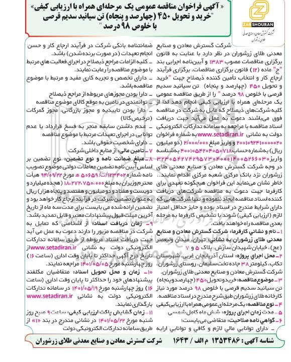 شرکت گسترش معادن و صنایع معدنی طلای زرشوران در نظر دارد با عنایت به قانون برگزاری مناقصات مصوب 1383 و آییننامه اجرایی بند ج ماده (12) قانون برگزاری مناقصات، برگزاری فرآیند ارجاع کار و انتخاب تامین کننده ذیصلاح جهت خرید و تحویل 450 (چهارصد و پنجاه) تن سیانید سدیم قرصی با خلوص 98 درصد را از طریق مناقصه عمومی یک مرحله ای همراه با ارزیابی کیفی انجام دهد لذا از کلیه شرکت های ذیصلاح که مایل به شرکت در مناقصه فوق می باشند دعوت به عمل میآید جهت دریافت اسناد مناقصه با مراجعه به سامانه تدارکات الکترونیکی دولت به نشانی ستاد ایران به شماره فراخوان 2001092410000020 و واریز مبلغ 2.000.000 .(دو میلیون ریال) به شماره حساب 4001054204050718 به شناسه واریز ۳۲۳۰۵۴۲۷۴۲۹۵۷۳۰۴۰۰۰۱۴۰۰۵۲۶۶۰۳۰ در وجه شرکت گسترش معادن و صنایع معدنی طلای زرشوران نزد بانک مرکزی شعبه مرکزی اقدام نمایند..خاطر نشان مینماید این فراخوان هیچگونه تعهدی برای کارفرما جهت دعوت به مناقصه شرکتهای دریافت کننده اسناد مناقصه ایجاد ننموده و تنها شرکتهایی که دارای شرایط مندرج در اسناد بوده و حایز حداقل امتیاز لازم (ارزیابی کیفی) شوند با تشخیص کارفرما به مرحله بعدی مناقصه راه خواهند یافت.