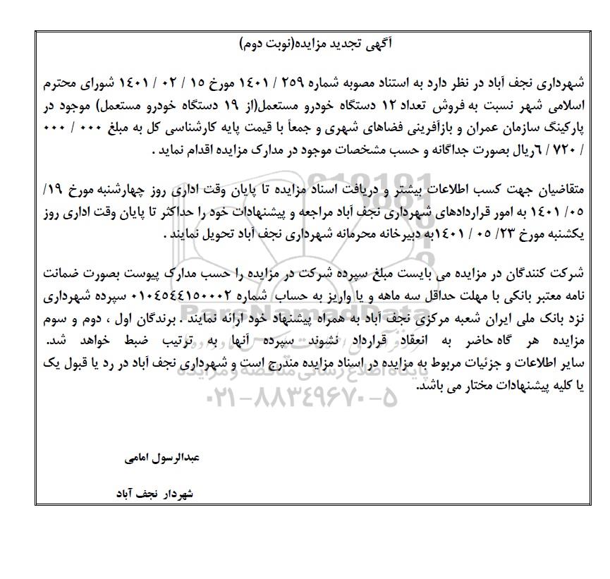 شهرداری نجف آباد در نظر دارد به استناد مصوبه شماره 259/1401 مورخ 1401.2.15 شورای محترم اسلامی شهر نجف آباد، نسبت به فروش تعداد 12 دستگاه خودرو مستعمل (از 19 دستگاه خودرو مستعمل) موجود در پارکینگ سازمان عمران و بازآفرینی فضاهای شهری و جمعا با قیمت پایه کارشناسی کل به مبلغ 6.720.000.000 ریال، بصورت جداگانه و حسب مشخصات موجود در مدارک مزایده اقدام نماید.