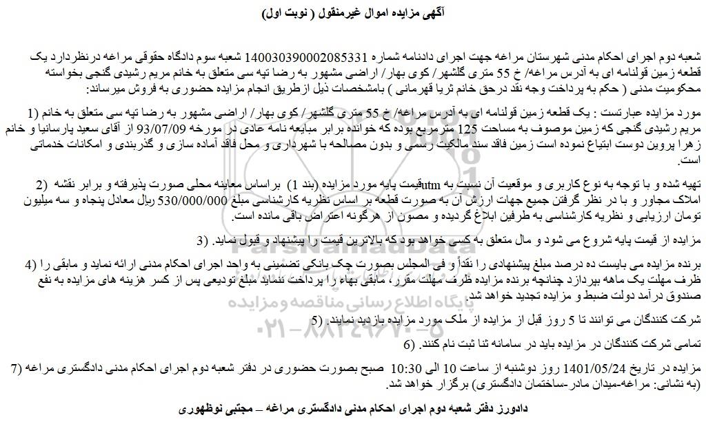 شعبه دوم اجرای احکام مدنی شهرستان مراغه جهت اجرای دادنامه شماره 140030390002085331 شعبه سوم دادگاه حقوقی مراغه درنظردارد یک قطعه زمین قولنامه ای به آدرس مراغه/ خ 55 متری گلشهر/ کوی بهار/ اراضی مشهور به رضا تپه سی متعلق به خانم مریم رشیدی گنجی بخواسته محکومیت مدنی ( حکم به پرداخت وجه نقد درحق خانم ثریا قهرمانی ) بامشخصات ذیل ازطریق انجام مزایده حضوری به فروش میرساند: