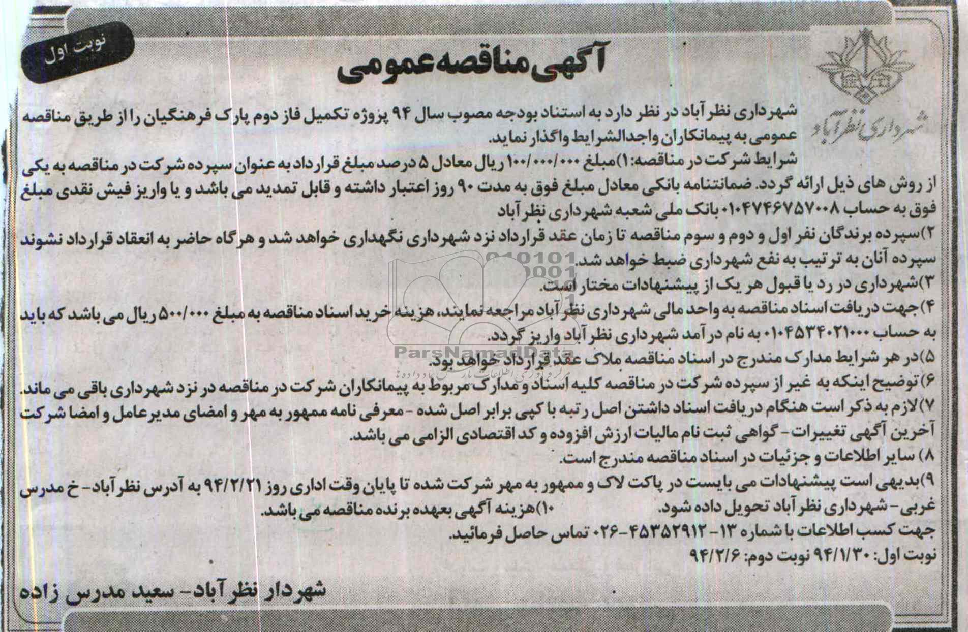 شهرداری نظرآباد در نظر دارد به استناد بودجه مصوب سال 94 پروژه تکمیل فاز دوم پارک فرهنگیان را از طریق مناقصه عمومی به پیمانکاران واجدالشرایط واگذار نماید.